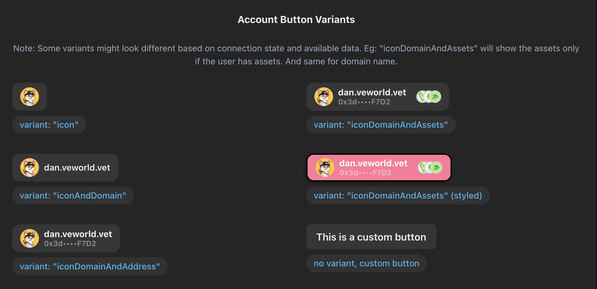 VeChain Kit provides multiple ways to customize the UI components. Here are some examples of different button styles and variants.